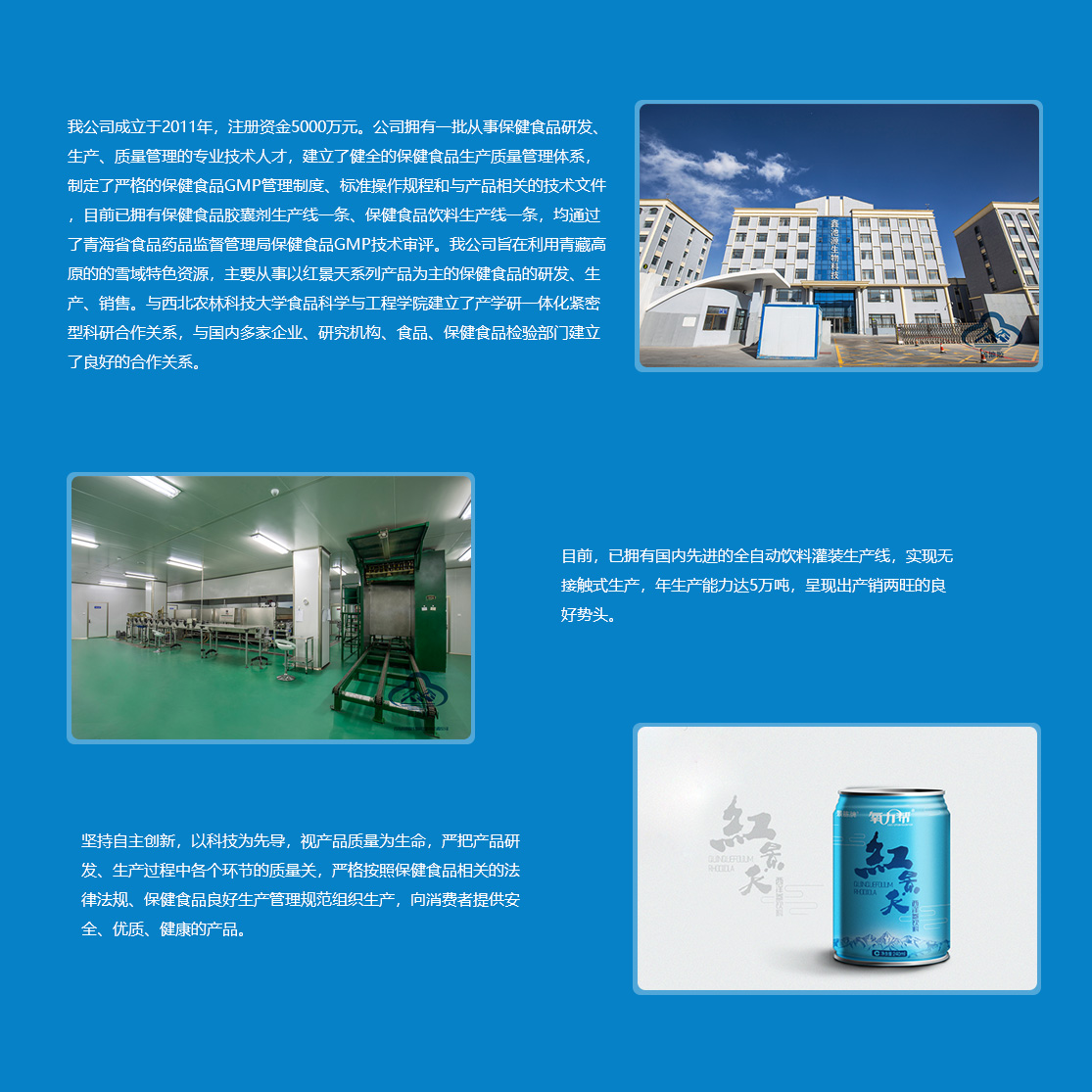 青海鑫池源生物科技開發有限公司2011年3月29日在青海生物科技產業園區工商行政管理分局登記成立,注冊資金5000萬元。         鑫池源公司立足于青海省綠色環保無污染的高品質紅景天資源,以西北農林科技大學食品科學與工程學院和青海格拉丹東藥業有限公司為技術依托,主要從事紅景天、紅枸杞、黑枸杞等高原生態植物資源的研究開發和深加工,產品包括“景胨”牌紅景天西洋參保健飲品、紅景天口服液、紅景天膠囊等系列產品。         公司擁有一批從事保健食品研發、生產、質量管理的專業技術人才,建立了健全的保健食品生產質量管理體系,制定了嚴格的保健食品GMP管理制度、標準操作規程和與產品相關的技術文件,目前已擁有保健食品膠囊劑生...